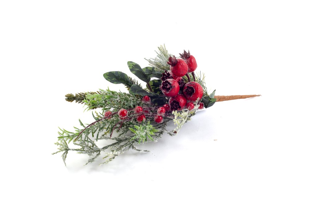 Umělá zasněžená větvička s červenými šípky (30 cm) je nadčasovým vánočním prvkem, který do aranžmá vnáší kontrastní barvu a zimní atmosféru. Posypání umělým sněhem podtrhuje sváteční charakter a přirozený vzhled dekorace.