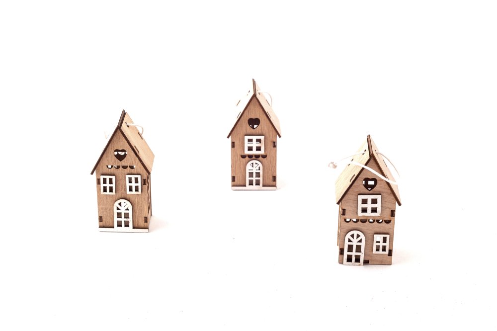Dřevěný domeček na zavěšení je univerzální dekorace, která se hodí nejen na vánoční stromeček. Jeho přírodní vzhled skvěle zapadne do rustikálních i severských aranžmá.